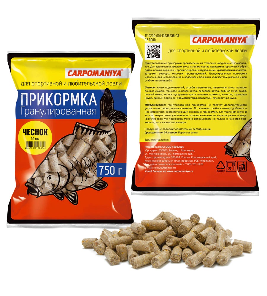 Использование: гранулированная прикормка не требует дополнительного увлажнения перед использованием. По желанию рыбака можно добавить в неё аттрактант, соответствующий названию прикормки, для усиления вкуса и запаха. Аттрактанты увеличивают продолжительность нерастворения в воде. Гранулированную прикормку можно использовать не только в качестве прикормки, но и в качестве насадки.